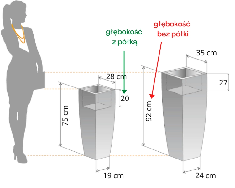 Donica Juno z wewnętrzną półką – jest to model z odlaną wewnętrzną półką na 1/3 wysokości od góry (20 cm dla rozmiaru 75 cm, 27 cm dla rozmiaru 92 cm). Takie rozwiązanie pozwala na sadzenie mniejszych roślin w dużych donicach. Pamiętaj, że w tym modelu półka jest odlewem wykonanym w całości z donicą i nie da się jej wyciągnąć lub później dołożyć.