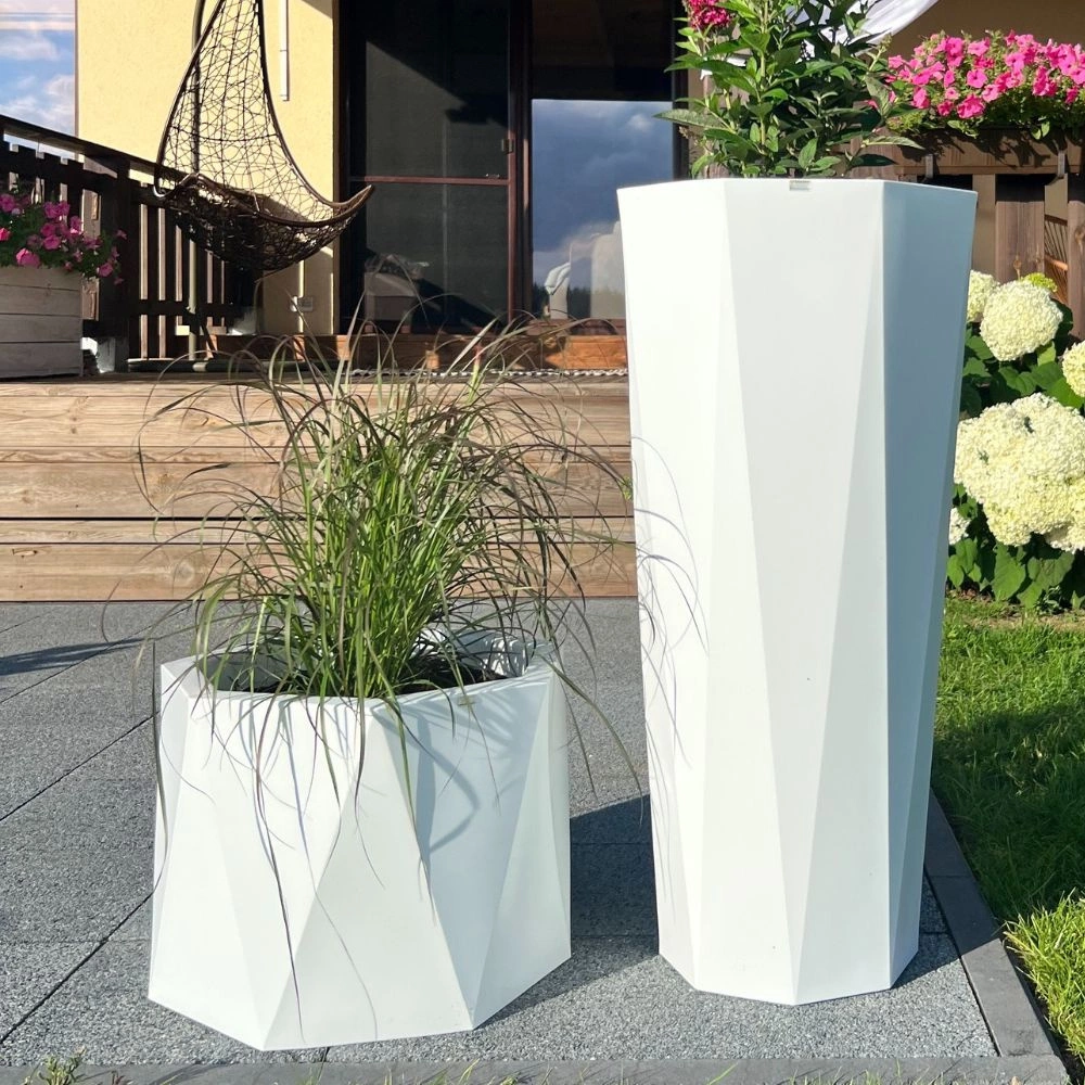 Wysoka, elegancka i wyrazista – donica Octavia to idealny wybór dla osób i firm, które chcą stworzyć spójną, stylową przestrzeń z charakterem. Jej geometryczny kształt o delikatnie zwężającej się podstawie dodaje nowoczesnego wyglądu zarówno tarasom i ogrodom, jak i wnętrzom komercyjnym, takim jak hotele, restauracje czy recepcje biur.