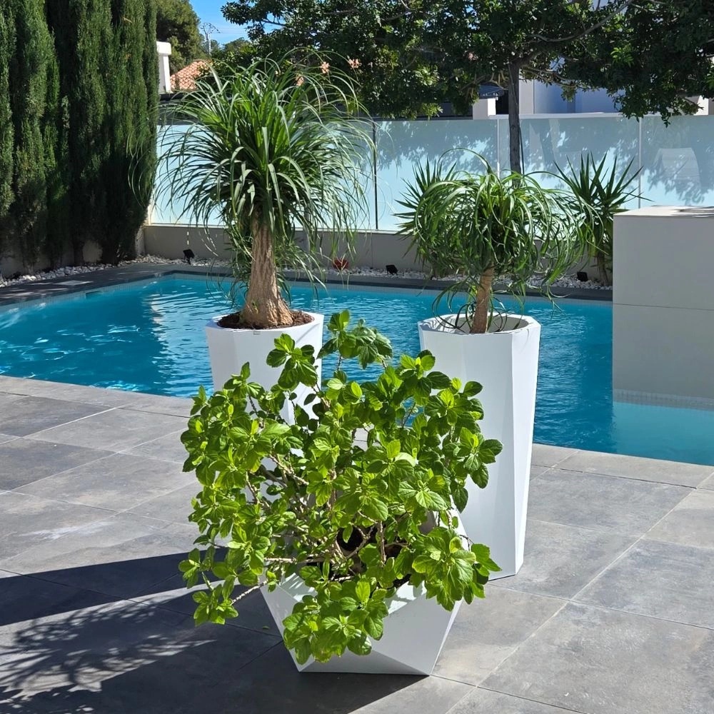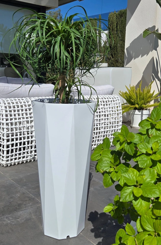 Wysoka, elegancka i wyrazista – donica Octavia to idealny wybór dla osób i firm, które chcą stworzyć spójną, stylową przestrzeń z charakterem. Jej geometryczny kształt o delikatnie zwężającej się podstawie dodaje nowoczesnego wyglądu zarówno tarasom i ogrodom, jak i wnętrzom komercyjnym, takim jak hotele, restauracje czy recepcje biur.