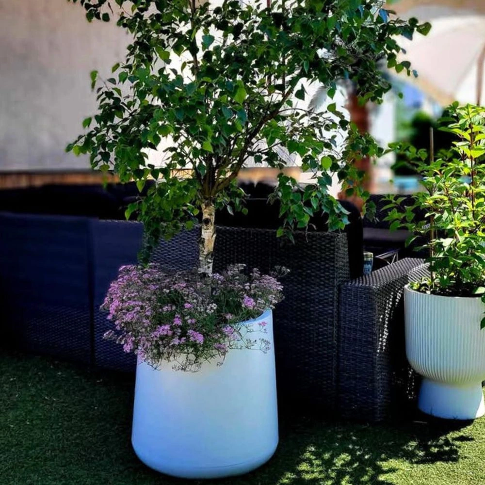 Donica podświetlana Zoe – jest to doniczka w naturalnym kolorze występująca w 2 wersjach podświetlenia. Możesz kupić model z żarówką LED o ciepłej lub zimnej barwie oraz z żarówką LED RGB, która pozwala na zmianę 16 barw światła za pomocą bezprzewodowego pilota.