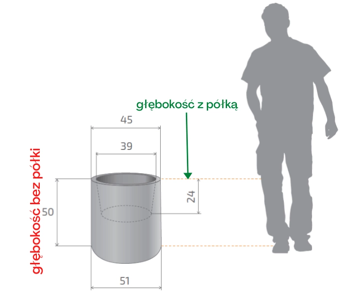Donica Zoe z wewnętrzną półką – jest to model z odlaną wewnętrzną półką na 1/2 wysokości od góry (24 cm). Takie rozwiązanie pozwala na sadzenie mniejszych roślin w dużych donicach. Pamiętaj, że w tym modelu półka jest odlewem wykonanym w całości z donicą i nie da się jej wyciągnąć lub później dołożyć.