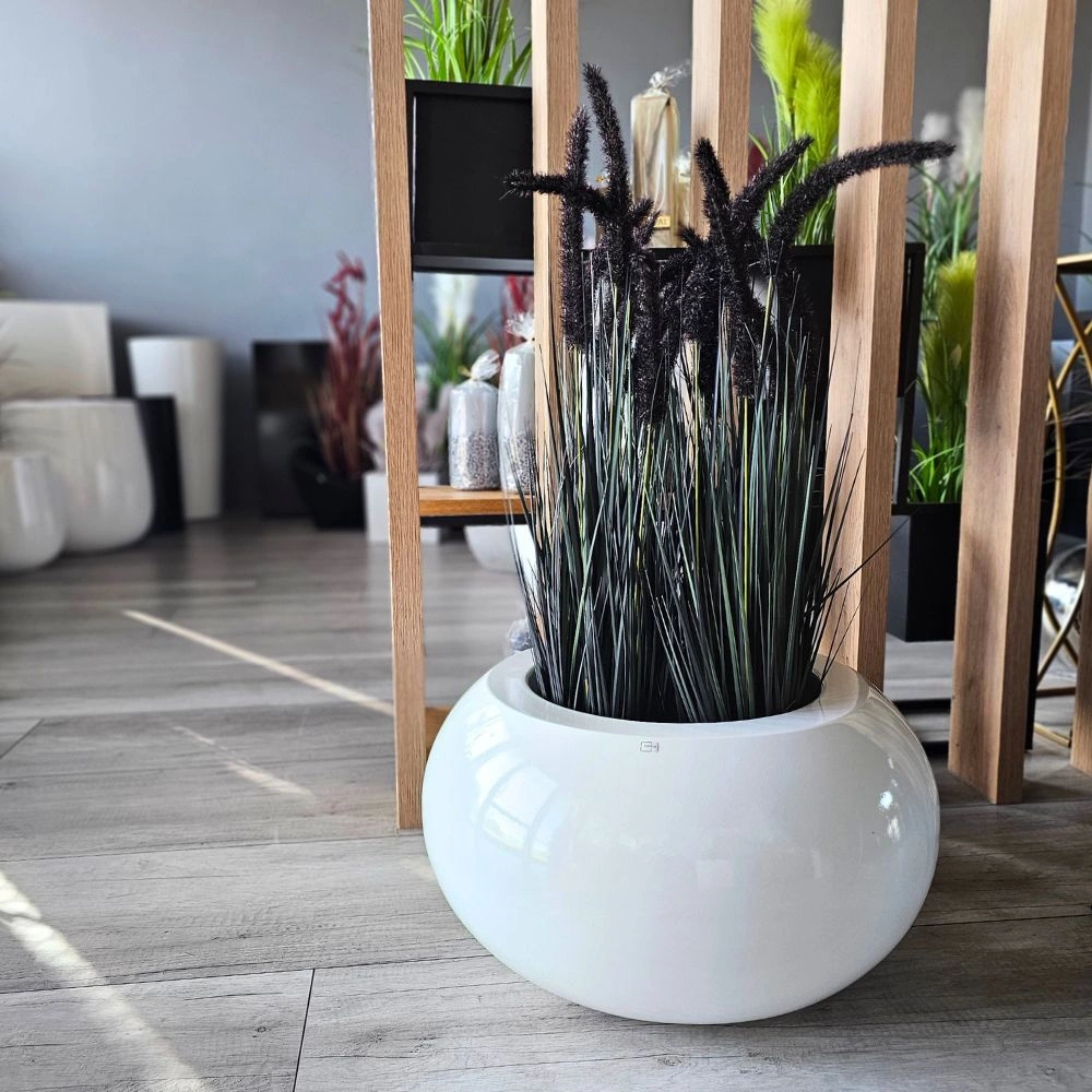 Donica Koral to niska i okrągła donica. Pięknie eksponuje takie rośliny jak np. storczyki, zamiokulkas, palma Areka, monstera, aglaonema czy trawy pampasowe.