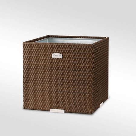 Donice wykonywane są ręcznie, z wysokiej jakości blachy ocynkowanej, która jest odporna na rdze i warunki atmosferyczne. Zewnętrzna warstwa donicy to splot technorattanowy, łączący w sobie wytrzymałość i elegancję. Uroku dodają dekoracyjne elementy aluminiowe polerowane - donica posiada ozdobne listwy boczne.