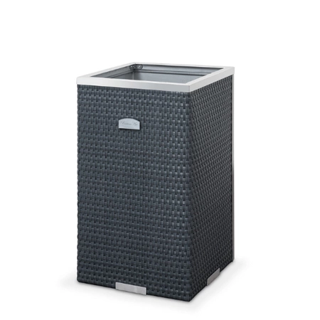 Donice wykonywane są ręcznie, z wysokiej jakości blachy ocynkowanej, która jest odporna na rdze i warunki atmosferyczne. Zewnętrzna warstwa donicy to splot technorattanowy, łączący w sobie wytrzymałość i elegancję. Uroku dodają dekoracyjne elementy aluminiowe polerowane - donica posiada dwie ozdobne listwy boczne oraz górną.