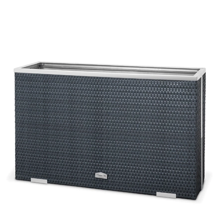 Donice wykonywane są ręcznie, z wysokiej jakości blachy ocynkowanej, która jest odporna na rdze i warunki atmosferyczne. Zewnętrzna warstwa donicy to splot technorattanowy, łączący w sobie wytrzymałość i elegancję. Uroku dodają dekoracyjne elementy aluminiowe polerowane - donica posiada dwie ozdobne listwy boczne oraz górną.
