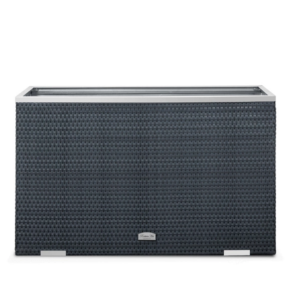 Donice wykonywane są ręcznie, z wysokiej jakości blachy ocynkowanej, która jest odporna na rdze i warunki atmosferyczne. Zewnętrzna warstwa donicy to splot technorattanowy, łączący w sobie wytrzymałość i elegancję. Uroku dodają dekoracyjne elementy aluminiowe polerowane - donica posiada dwie ozdobne listwy boczne oraz górną.