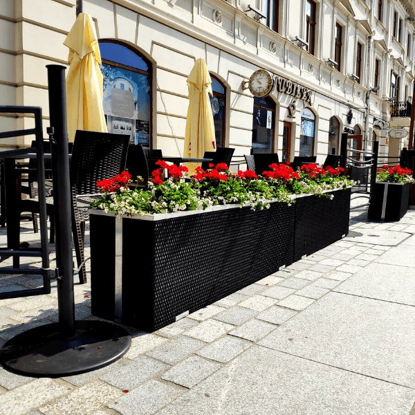 • Donica wykonana jest z wyplatanego technorattanu, który świetnie komponuje się z meblami ogrodowymi. Donice świetnie sprawdzają się też w ogródkach restauracyjnych, miejscach przestrzeni publicznej czy hotelach.