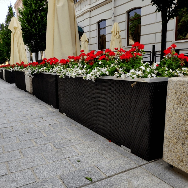 • Donica wykonana jest z wyplatanego technorattanu, który świetnie komponuje się z meblami ogrodowymi. Donice świetnie sprawdzają się też w ogródkach restauracyjnych, miejscach przestrzeni publicznej czy hotelach.
