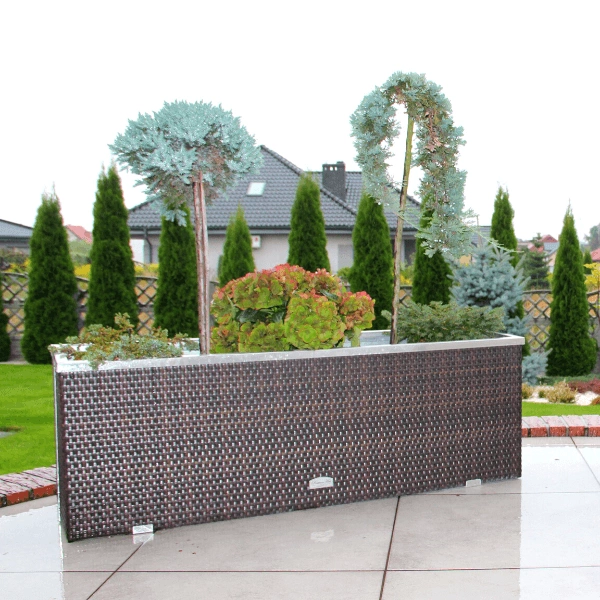 Donice wykonywane są ręcznie, z wysokiej jakości blachy ocynkowanej, która jest odporna na rdze i warunki atmosferyczne. Zewnętrzna warstwa donicy to splot technorattanowy, łączący w sobie wytrzymałość i elegancję. Uroku dodają dekoracyjne elementy aluminiowe polerowane - donica posiada dwie ozdobne listwy boczne oraz górną.