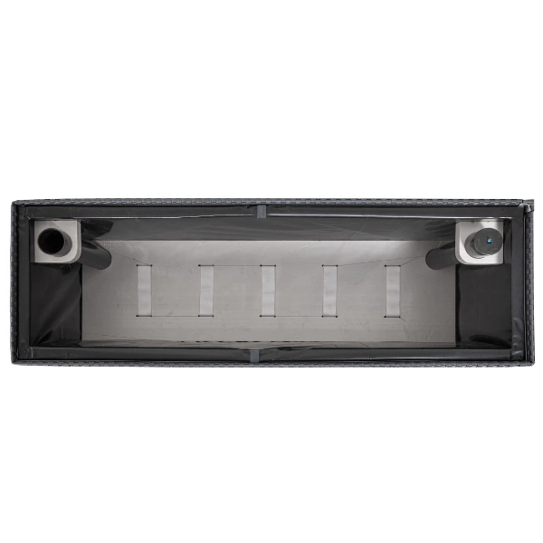 Donice wykonywane są ręcznie, z wysokiej jakości blachy ocynkowanej, która jest odporna na rdze i warunki atmosferyczne. Zewnętrzna warstwa donicy to splot technorattanowy, łączący w sobie wytrzymałość i elegancję.