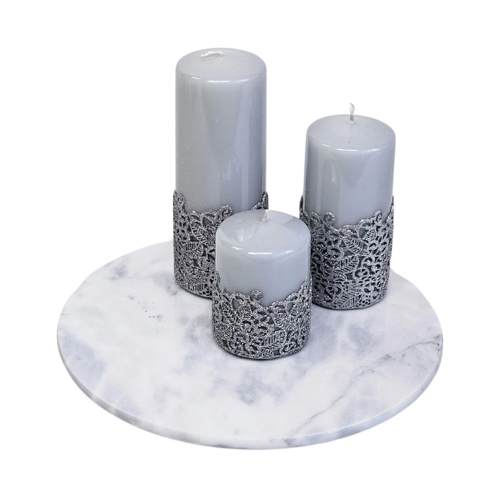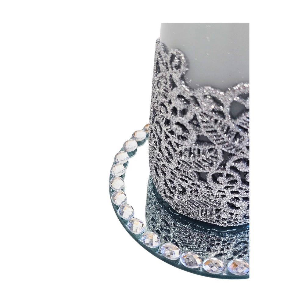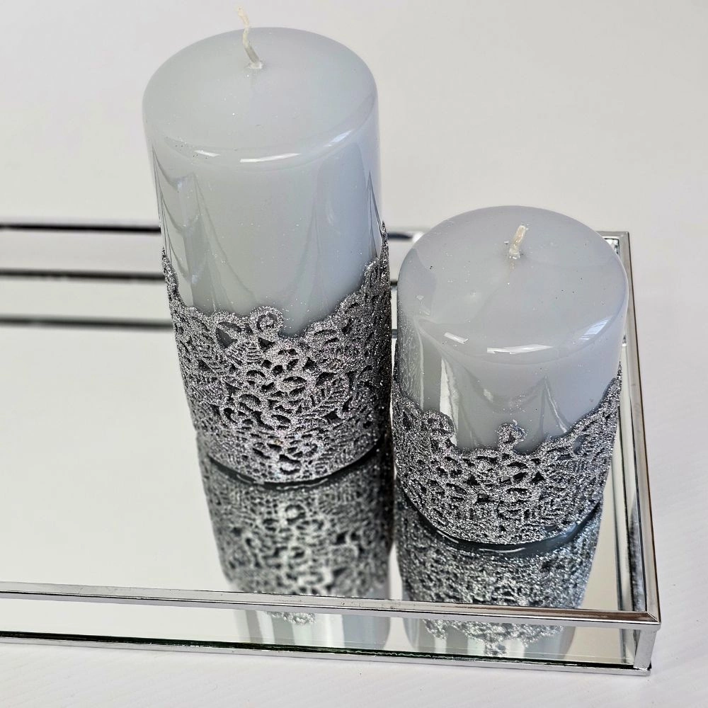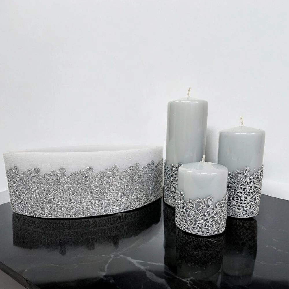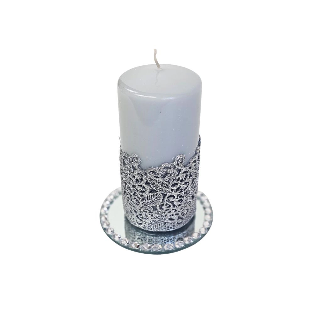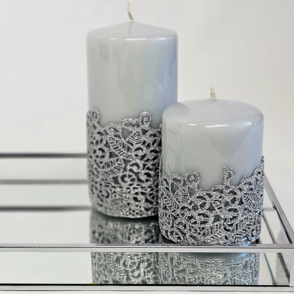 • Świece Koronka są wykończone w połysku i ozdobione brokatową koronką z efektem 3D. Ta seria świec to idealny wybór dla osób, które cenią sobie elegancje w wystroju wnętrz. Świeca jest bezzapachowa i dostępna w 3 rozmiarach.