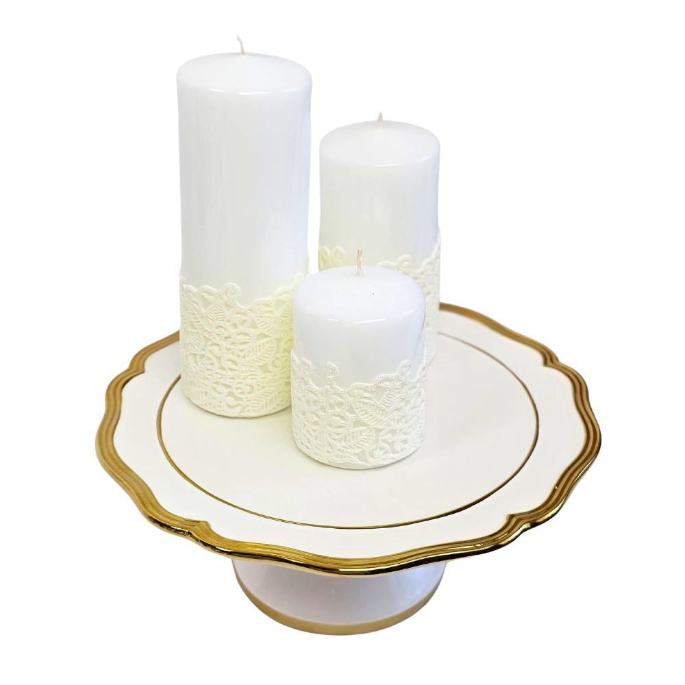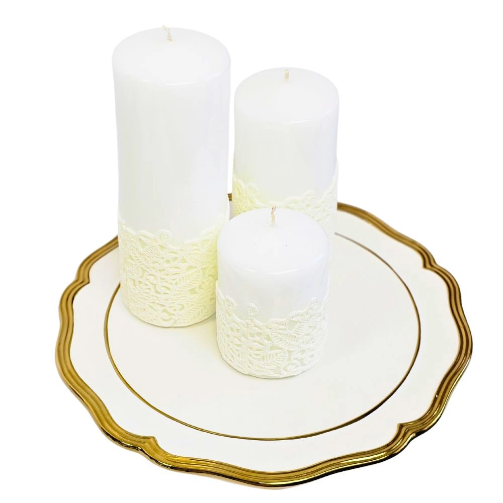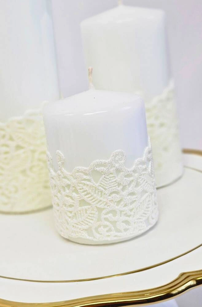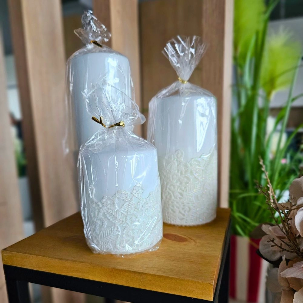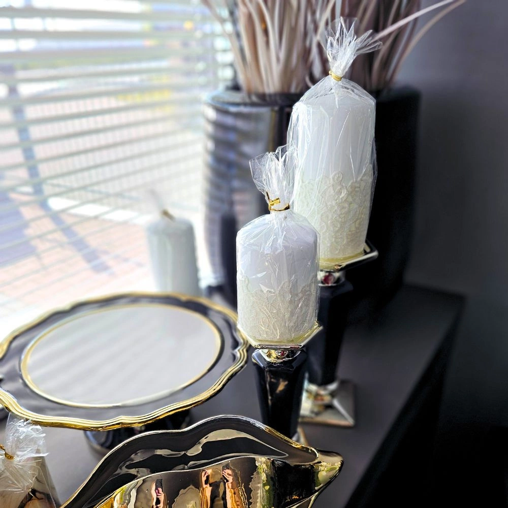 Eleganckie świeczki Koronka charakteryzują się pięknym, błyszczącym wykończeniem, natomiast dolna część świeczek zdobiona jest brokatową koronką 3D, co dodaje im wyjątkowego charakteru. Zaletą tych świeczek jest przede wszystkim ich uniwersalność – doskonale pasują do różnych stylów wnętrzarskich, od nowoczesnych, przez glamour, aż po klasyczne aranżacje.