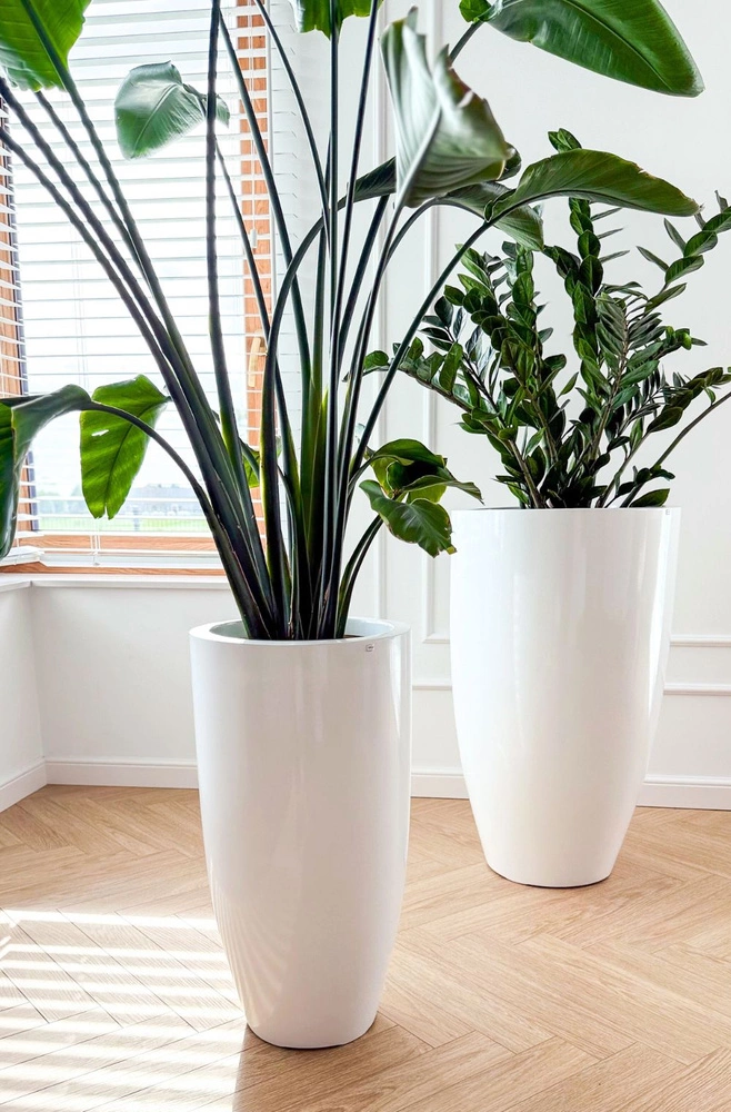 Donica Tulip to wysoka donica o zaokrąglonym kształcie. Świetnie będą się w niej prezentować takie rośliny jak: zamiokulkasy, palmy, strelitzie, sansewierie, pachiry czy sztuczne trawy. Donice w połysku to idealny wybór nie tylko do wnętrz.