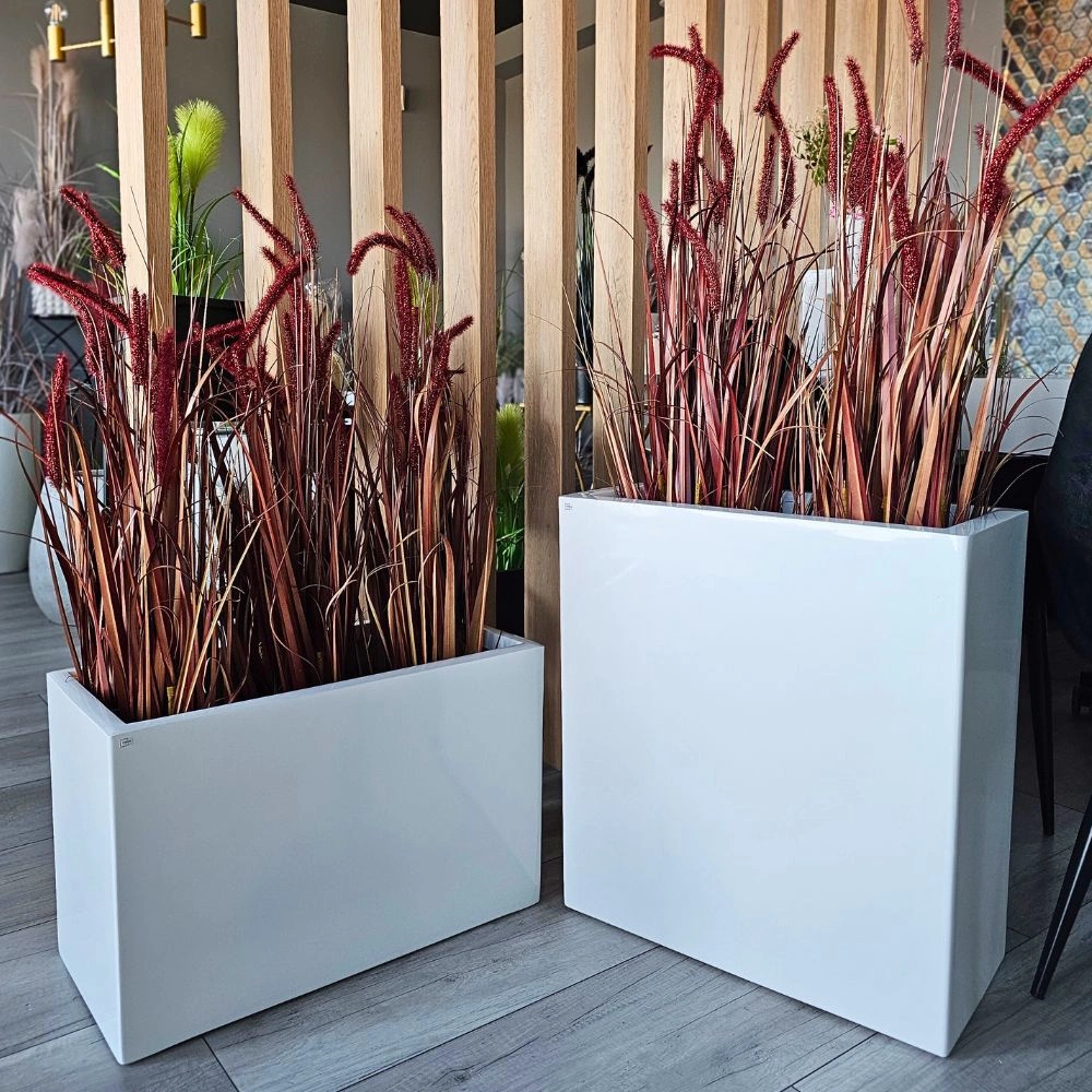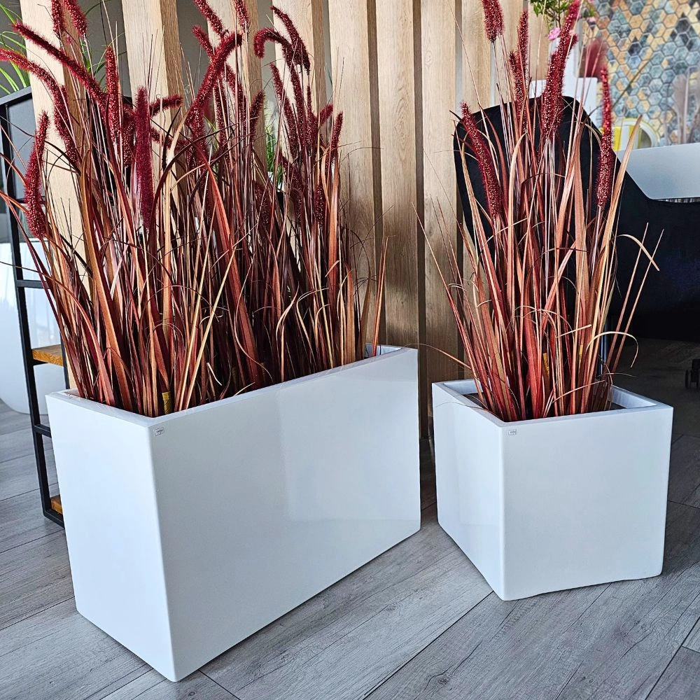 w biurze posłużą do wyznaczania granic pomiędzy strefami użytkowymi. Wysoki połysk włókna szklanego świetnie pasuje do nowoczesnych przestrzeni, a zieleń pomaga w odprężeniu i poprawia wydajność pracy.