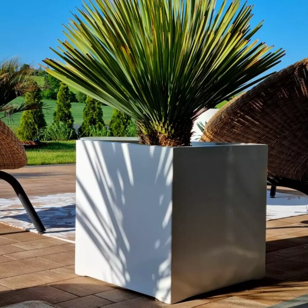 Duże donice kwadratowe będą dobrym wyborem do przestronnych salonów, holi, poczekalni lub na zewnątrz. W pojemnych donicach warto sadzić krzewy, małe drzewka typu tuja, katalpa, berberysy itp.