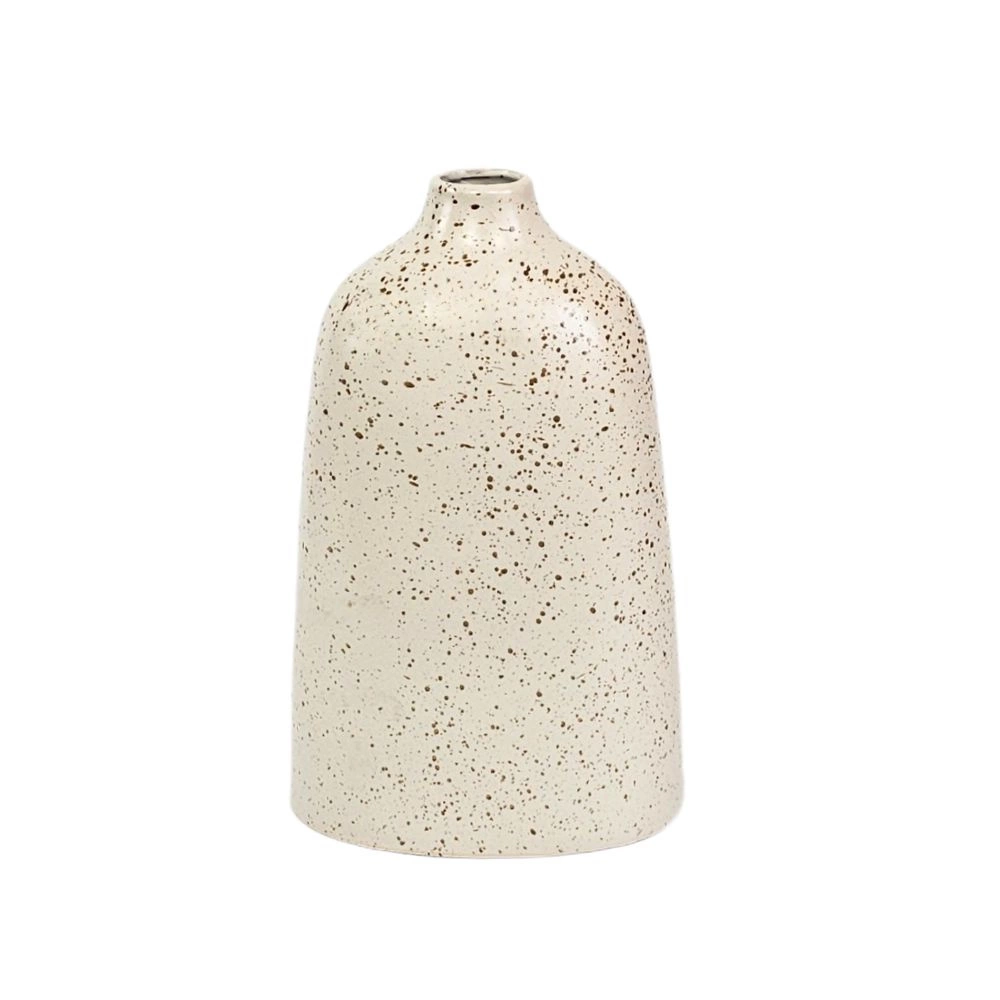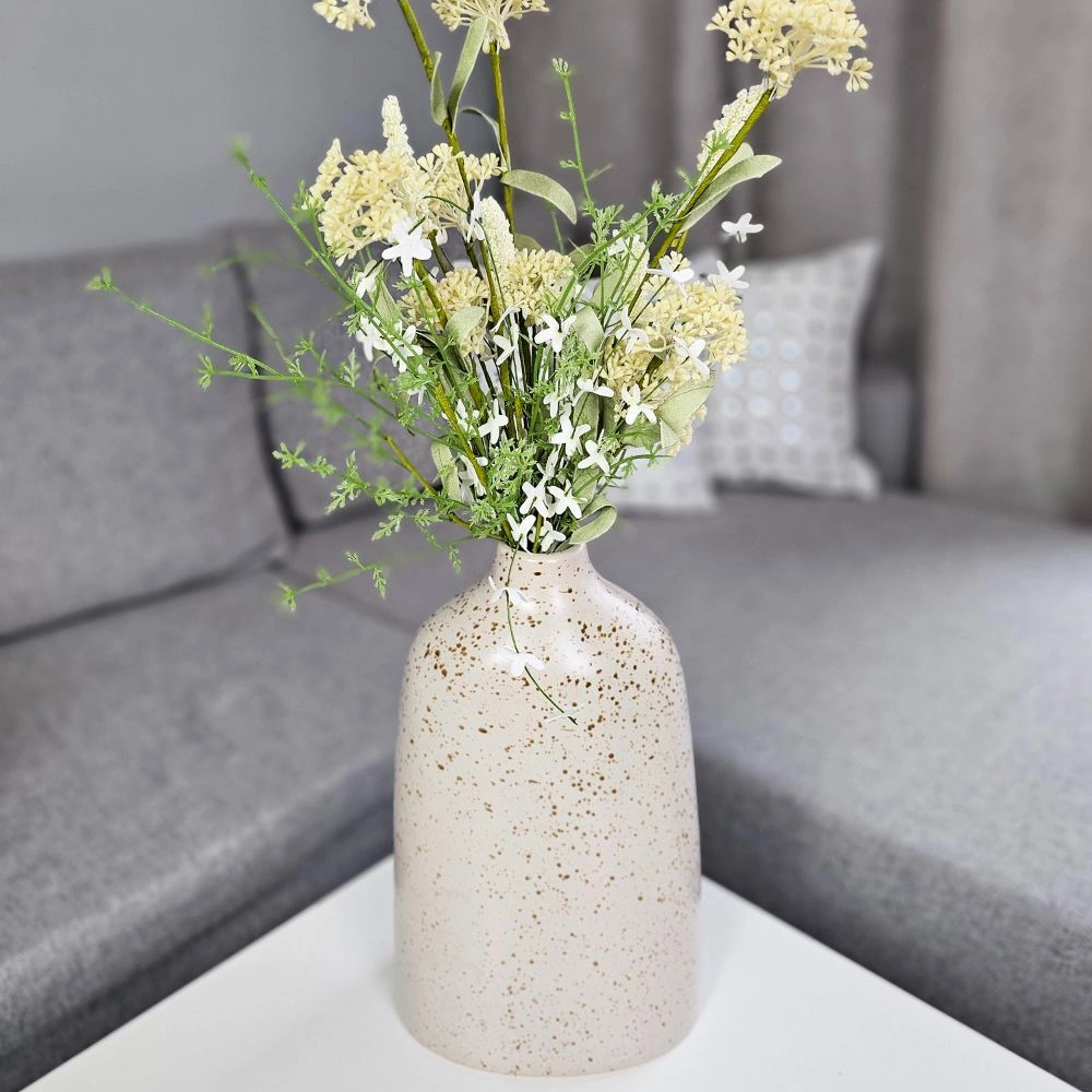 Dodaj subtelny akcent do swojego wnętrza z wazonem Toledo w stylu minimalistycznym. Jego prosta forma i delikatne nakrapiane wykończenie sprawiają, że idealnie komponuje się zarówno z nowoczesnymi, jak i klasycznymi aranżacjami. Świetnie sprawdzi się jako dekoracja solo lub w duecie z kwiatami – świeżymi i suszonymi.