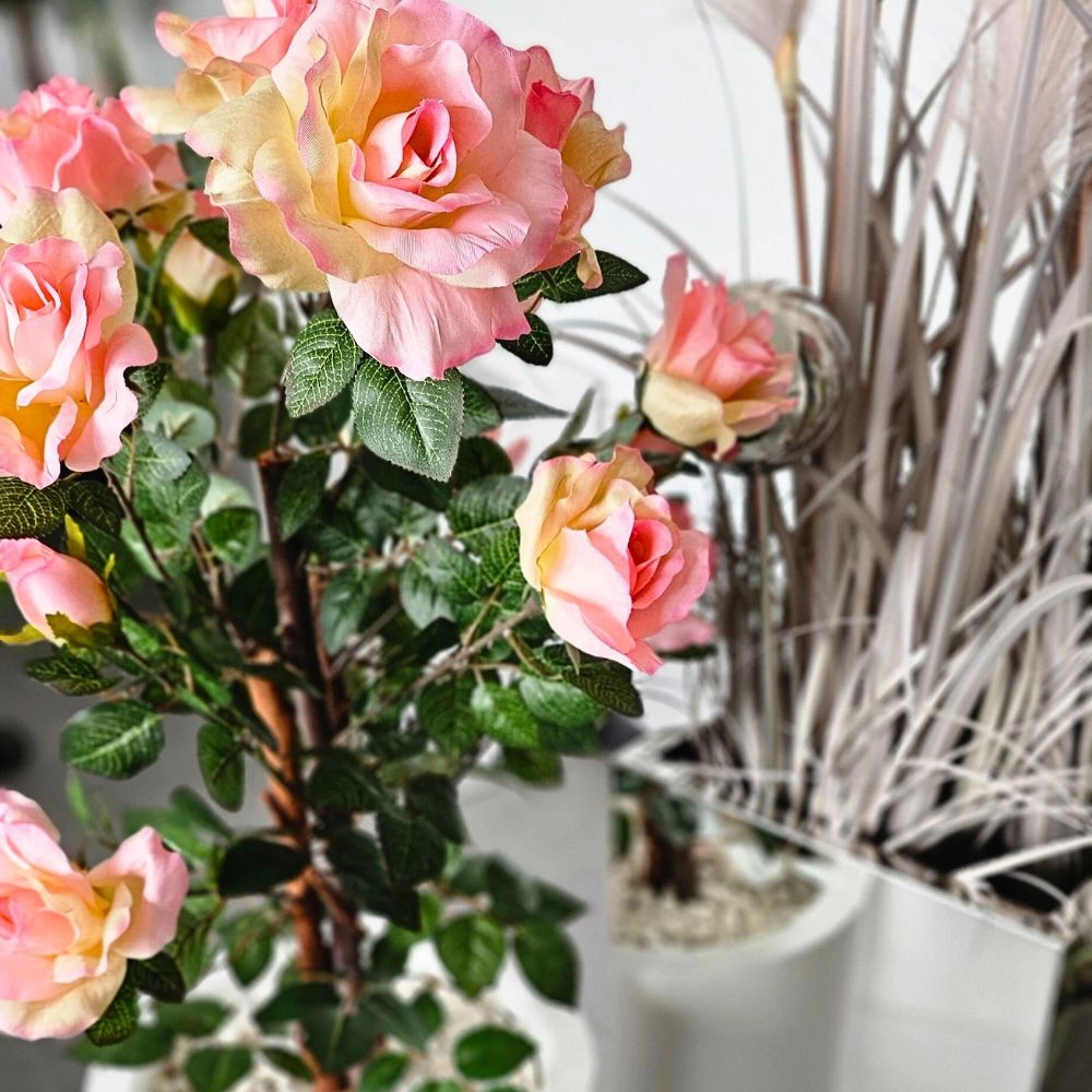 Sztuczna róża na pniu to elegancka dekoracja, która wiernie odwzorowuje naturalną roślinę. Gęste liście i wielokolorowe kwiaty w odcieniach różu i kremu nadają wnętrzu romantyczny charakter.