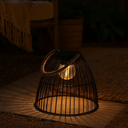 Lampa solarna to idealne połączenie eleganckiej formy i ekologicznego rozwiązania oświetleniowego. Konstrukcja inspirowana stylem boho w kolorze czerni skrywa subtelną plastikową żarówkę, która emituje przyjemne światło. Całość dopełnia górny panel solarny, który zapewnia zasilanie bez konieczności podłączania do prądu.