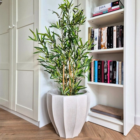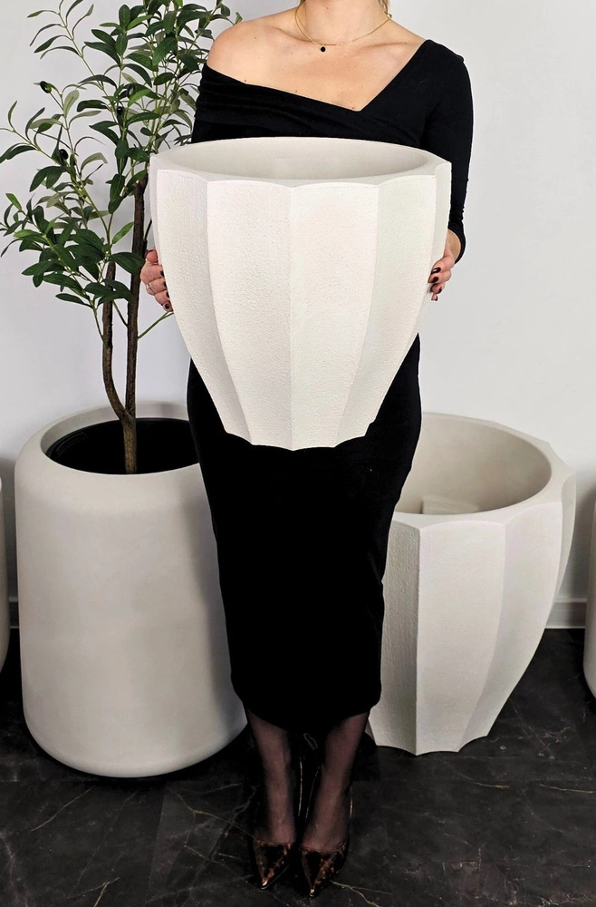 Doniczka Avia ma elegancką, lekko zwężaną ku dołowi formę z dekoracyjnymi, pionowymi przetłoczeniami. Jej geometryczny kształt i faktura imitująca kamień nadają jej nowoczesny, a zarazem ponadczasowy wygląd.