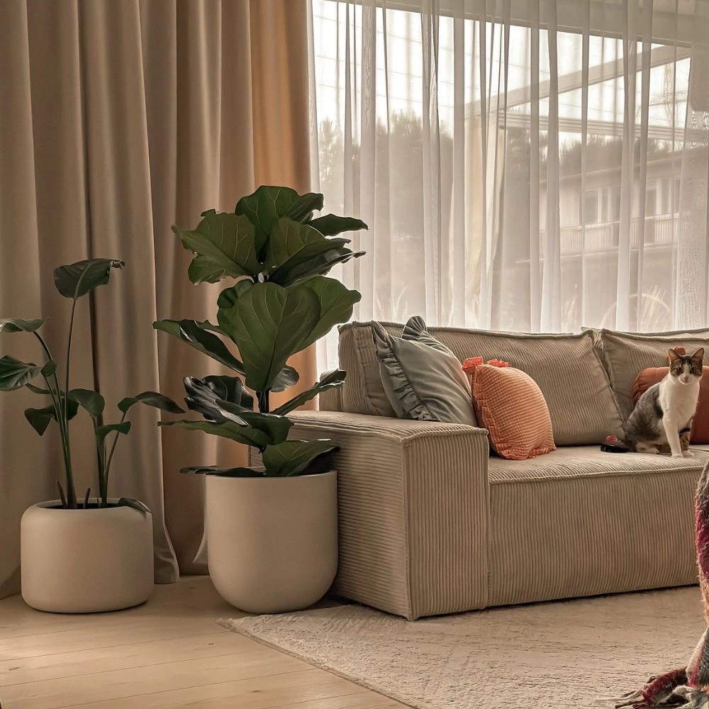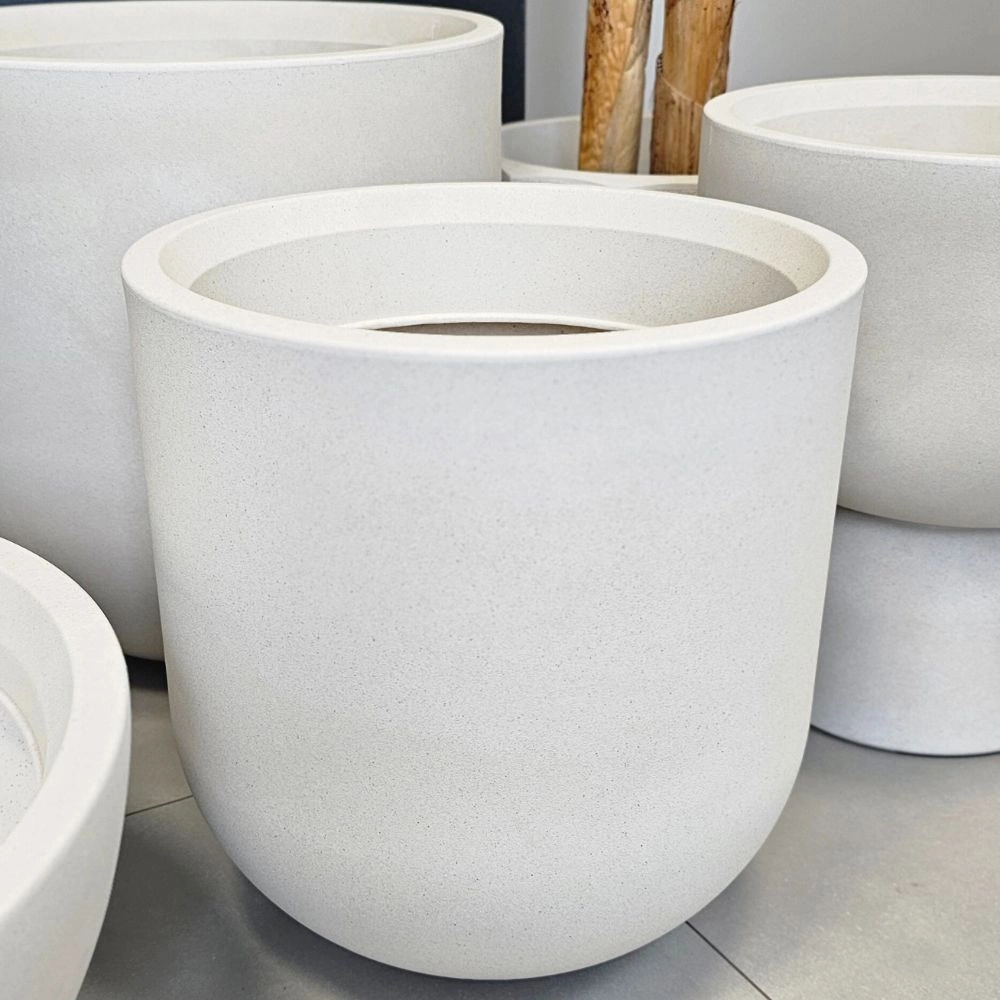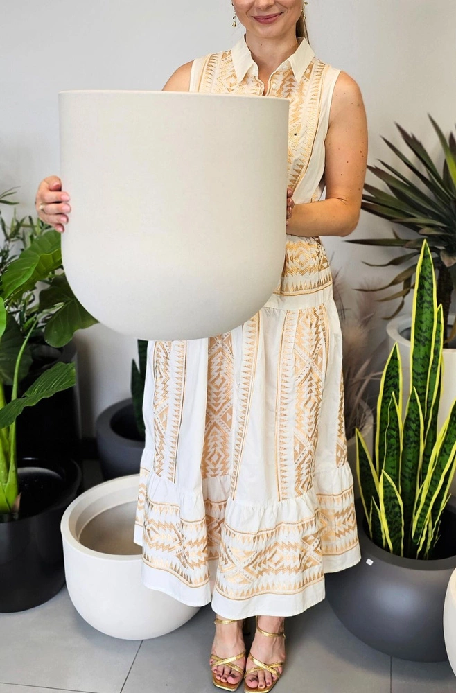 Duża doniczka Fero ma klasyczny, obły kształt z delikatnie zaokrąglonym dnem i prostymi ściankami. Jej gładka, matowa powierzchnia i naturalny kolor czynią ją wyjątkowo uniwersalną – pasuje zarówno do nowoczesnych, jak i bardziej naturalnych lub klasycznych aranżacji.