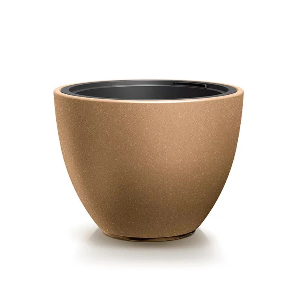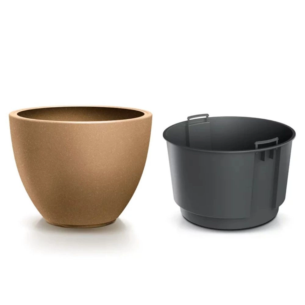 Doniczka Grano wymodelowana jest w łagodnie zaokrąglonej, nowoczesnej formie. W doniczce jest wyjmowany wkład z wygodnymi rączkami, który umożliwia prostą pielęgnację roślin: nie ma potrzeby wypełniania całej donicy ziemią, a pielęgnacja i przesadzanie przebiegają szybko i czysto. Głęboki kolor brązowy donica zawdzięcza dodatkowi ziaren kawy w materiale.