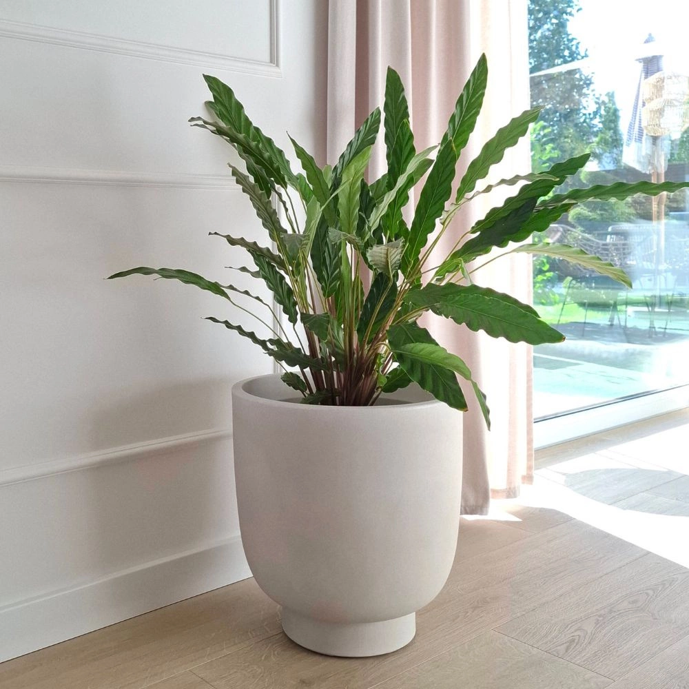 Donica okrągła Vivo zachwyca prostą, ale wyrafinowaną formą zaokrąglony kształt i delikatna, niska nóżka tworzą spójną, nowoczesną bryłę. To doskonała baza do stylowych aranżacji z roślinami – od egzotycznych liści, przez trawy ozdobne, po minimalistyczne kompozycje z sukulentów.