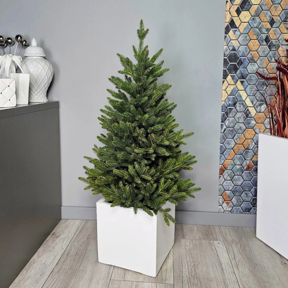 Choinki zamiast tradycyjnego stelaża posiadają funkcjonalną doniczkę. Możesz ją udekorować np. ozdobnymi kamieniami, korą, mchem czy ozdobami świątecznymi.