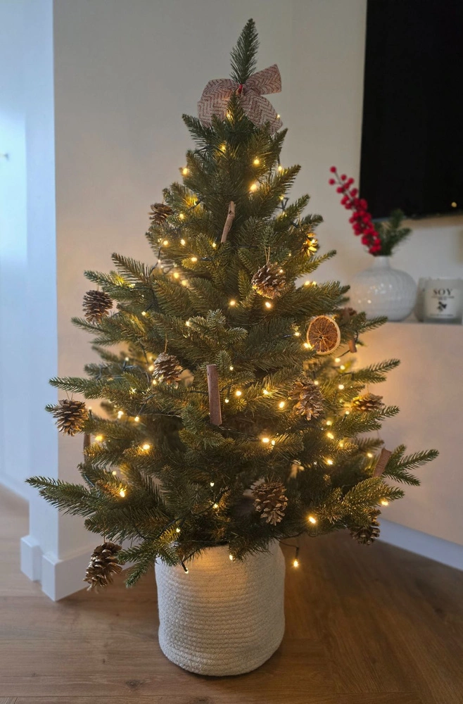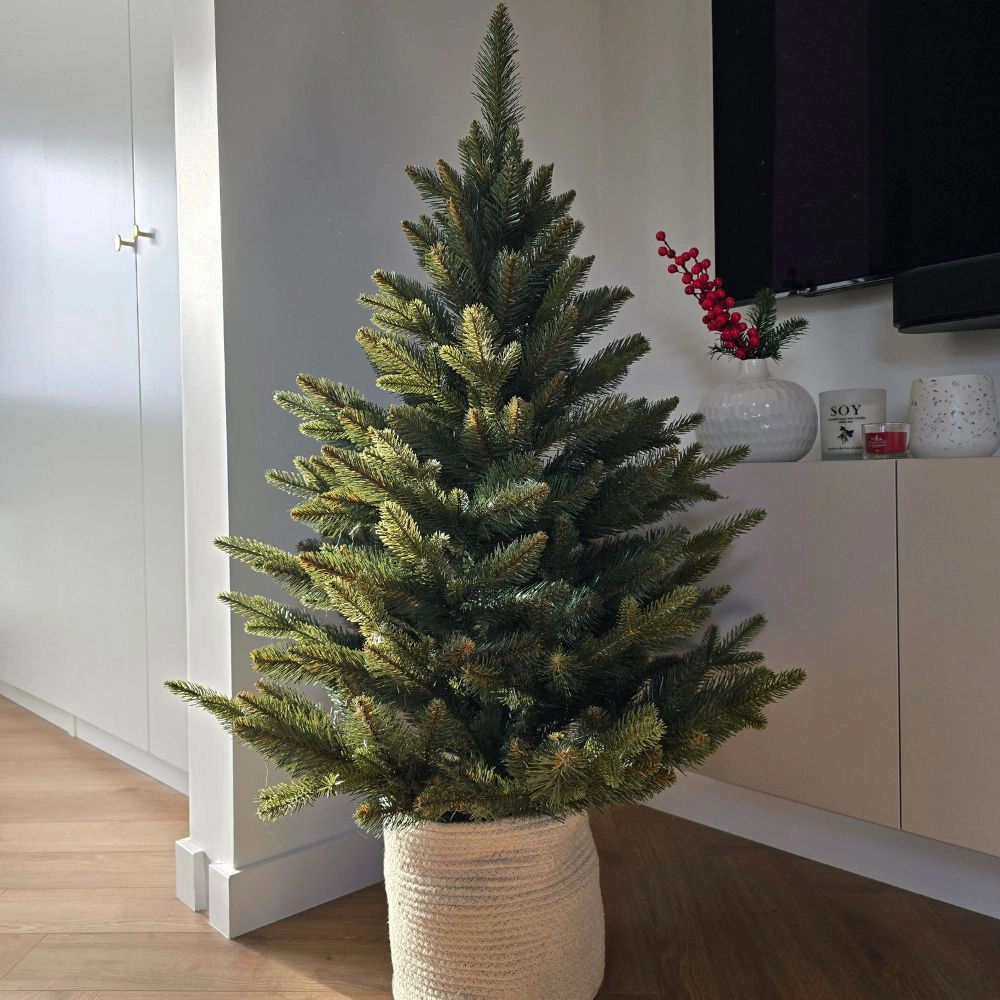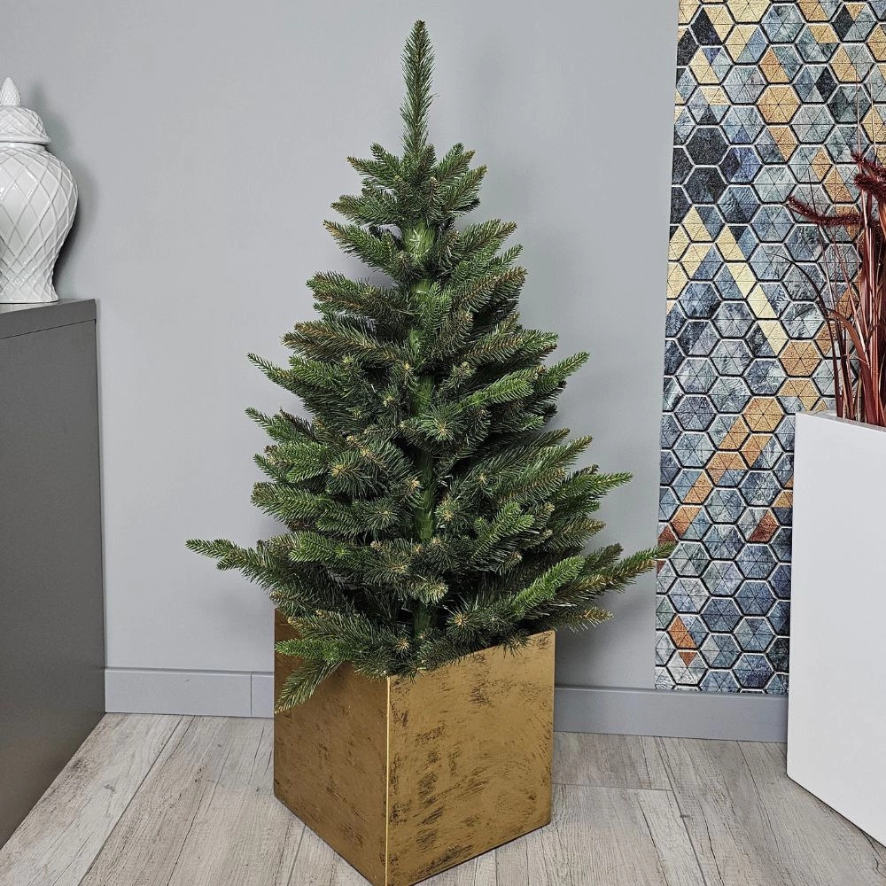 Choinki zamiast tradycyjnego stelaża posiadają niezwykle funkcjonalną donicę. Możesz ją udekorować np. ozdobnymi kamieniami, korą czy mchem.