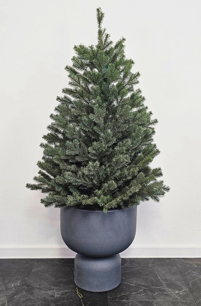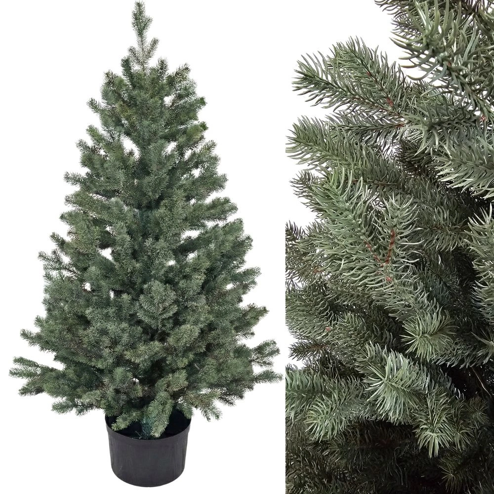 Doniczka ma wymiary: średnica 23 cm, wysokość 15 cm. Wysokość choinki jest podawana razem z doniczką - pień sięga samego dna doniczki, dzięki czemu choinka nie traci na swojej rzeczywistej wysokości. Wysokość choinki w doniczce jest taka sama jak wysokość choinki na stelażu.