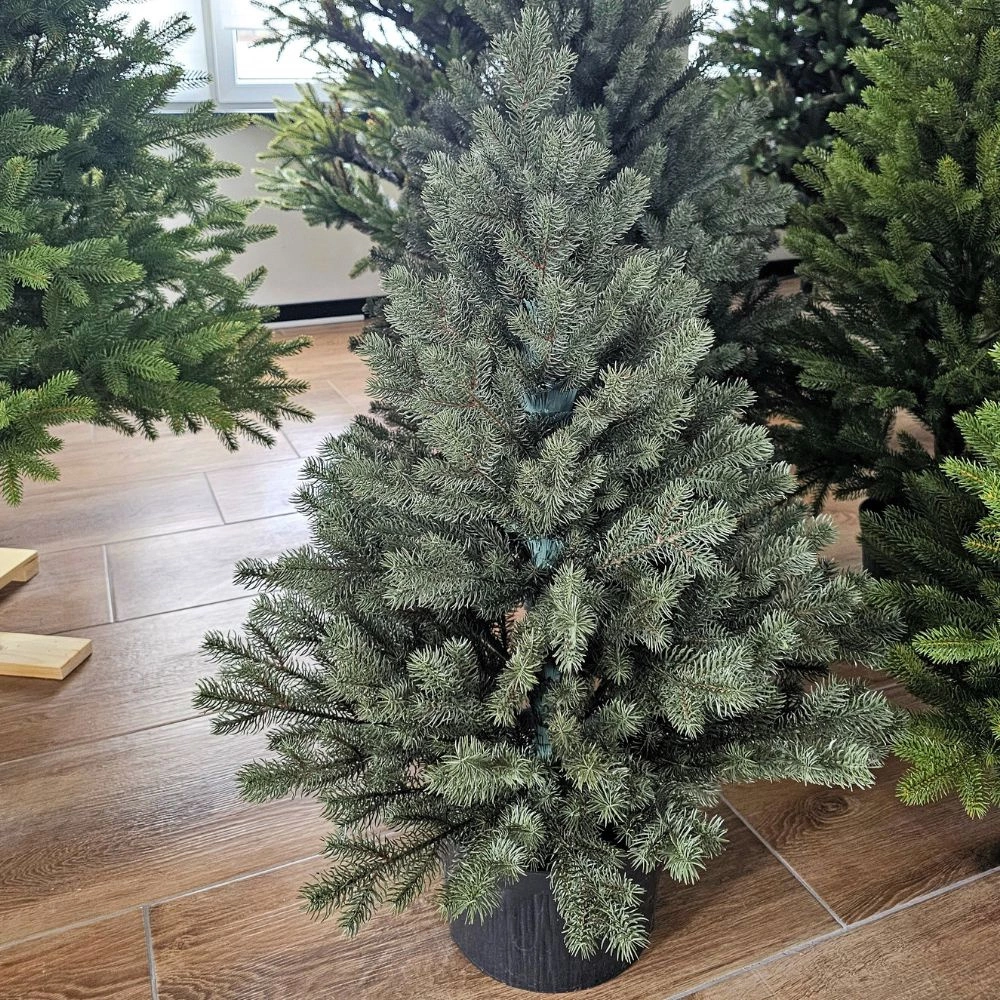 Choinki zamiast tradycyjnego stelaża posiadają funkcjonalną doniczkę. Możesz ją udekorować np. ozdobnymi kamieniami, korą, mchem czy ozdobami świątecznymi.
