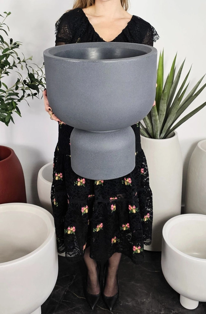 Donice na taras Molta to doskonały wybór dla miłośników nowoczesnego designu i naturalnej estetyki. Kolekcja łączy subtelność owalnych kształtów z wyrazistością geometrycznych form, inspirowanych naturą i klasycznym rzemiosłem garncarskim. Donica ma kształt kielicha, który jest osadzony na niskiej i szerokiej nóżce.