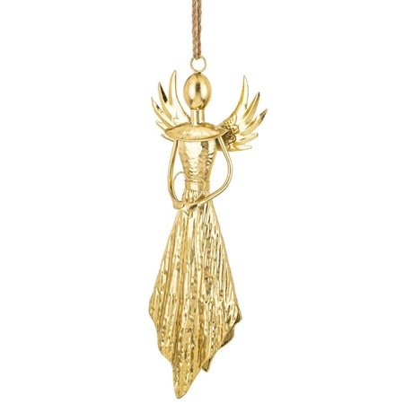 Elegancka ozdoba bożonarodzeniowa z metalu o złotym połysku. Metalowy anioł o finezyjnych skrzydłach i fakturowanej sukni zawieszony jest na grubym, naturalnym sznurku, dzięki czemu prezentuje się solidnie i stylowo. Idealny do dekoracji drzwi, okna, choinki lub kompozycji świątecznych. Wprowadza do wnętrza ciepło, blask i świąteczną harmonię.