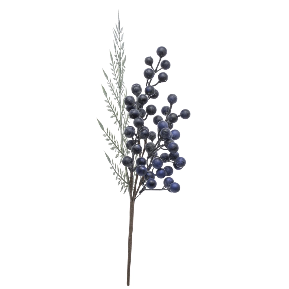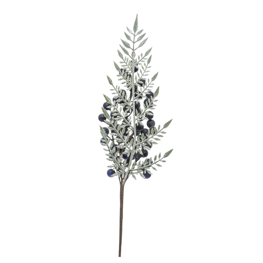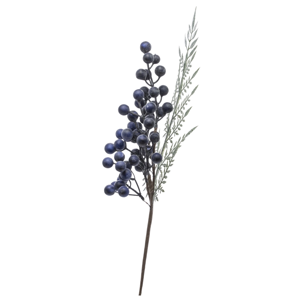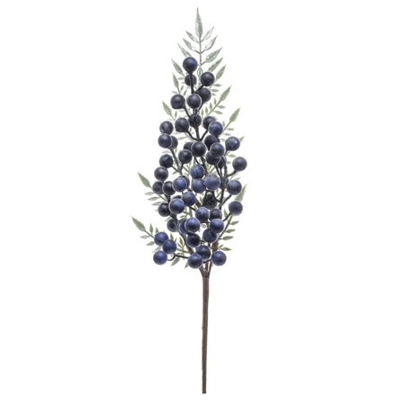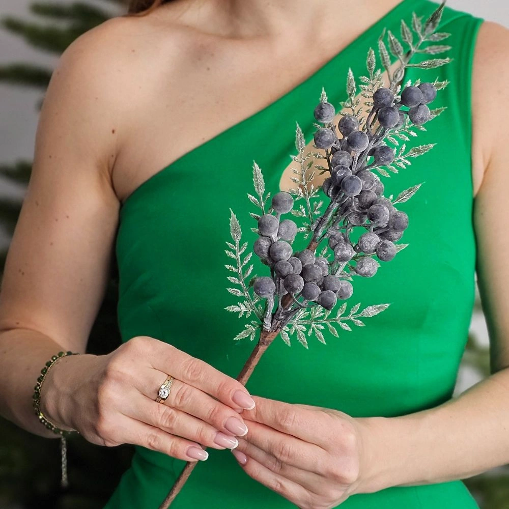 Elegancka, dekoracyjna gałązka głogu z realistycznymi, granatowymi owocami i drobnymi, zielonymi listkami. Wykonana z dbałością o detale, prezentuje się naturalnie i efektownie, dodając kompozycjom głębi oraz wyrazistego koloru.