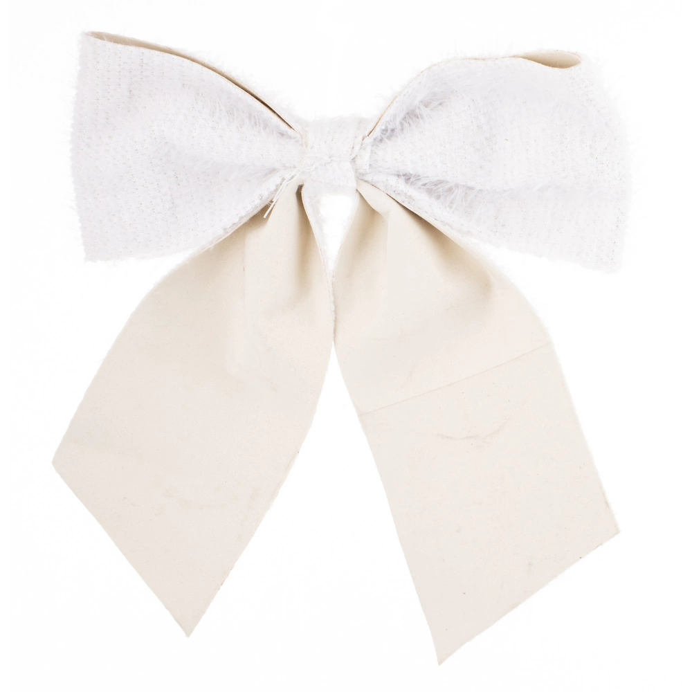 Elegancka, kokarda świąteczna w kremowym kolorze, wykonana z miękkiego, pluszowego materiału. Jej klasyczny kształt i delikatny kolor dodają dekoracjom wyjątkowego, świątecznego uroku. Idealnie sprawdzi się jako ozdoba choinki, drzwi, balustrady, prezentu lub świątecznych aranżacji w domu i firmie.
