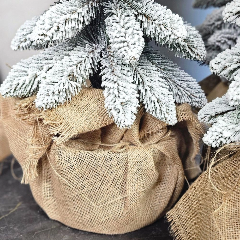 Choinki zamiast tradycyjnego stelaża posiadają funkcjonalną doniczkę, owiniętą jutą. Całość wygląda nie tylko pięknie ale jest u praktyczna - choinka jest stabilna, a jeśli ma stać na zewnątrz możesz ją dociążyć kamieniami lub piaskiem.